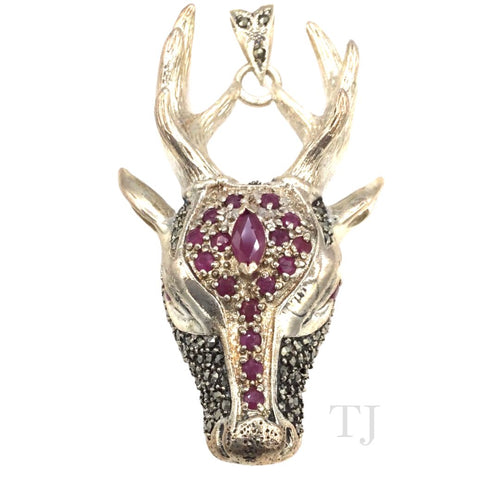 Emerald in Deer Shape with Ruby Eye in Sterling Silver Pendant